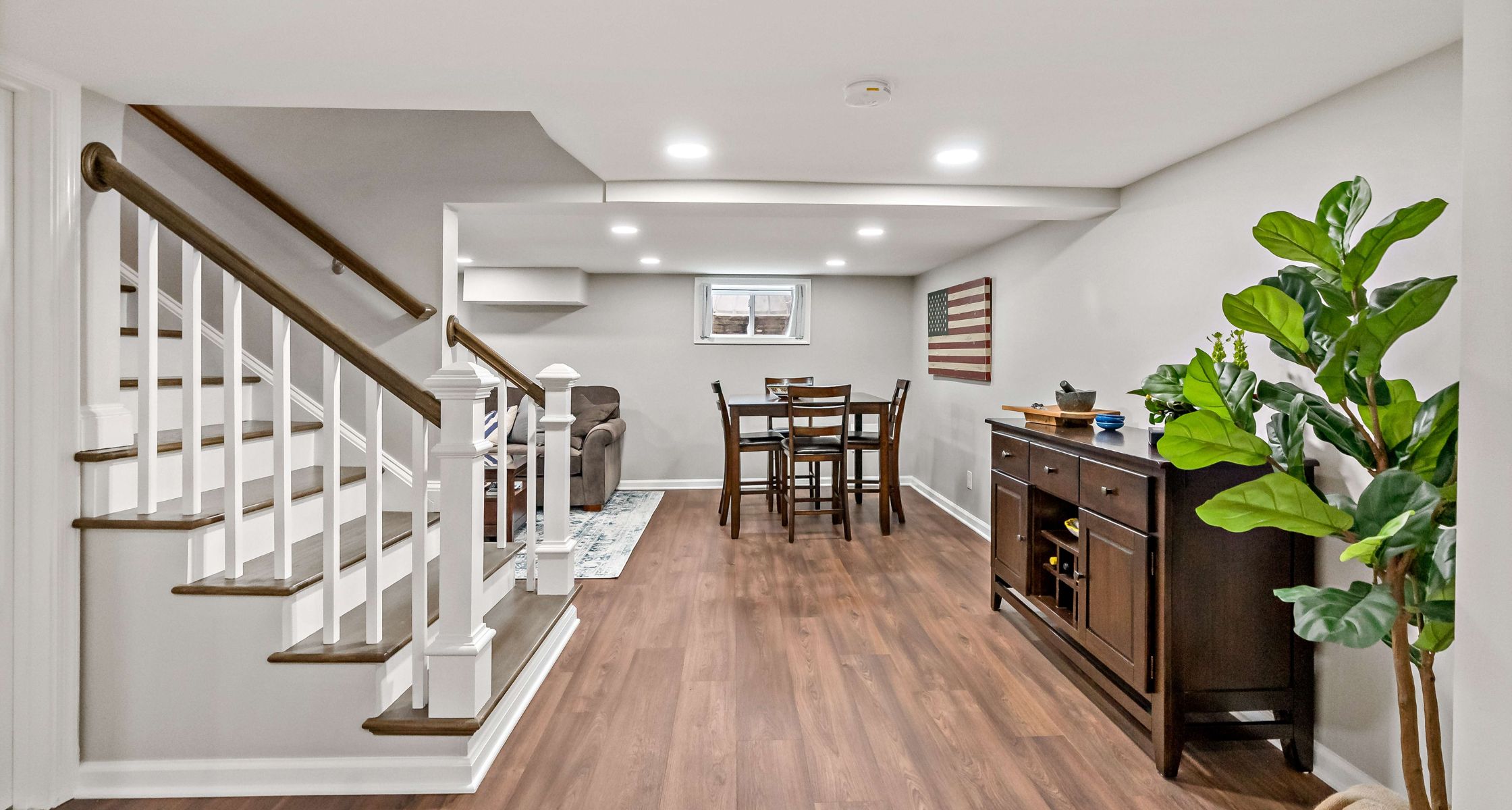 Go for pale wall shades. They bounce around what little daylight you get down there. Use built in ceiling spots where they’re most needed. Mix up your lights: general glow from above focused beams on desks or counters plus small accent lamps to set a mood. A well lit room feels bigger. Strong illumination helps avoid that closed in basement vibe.